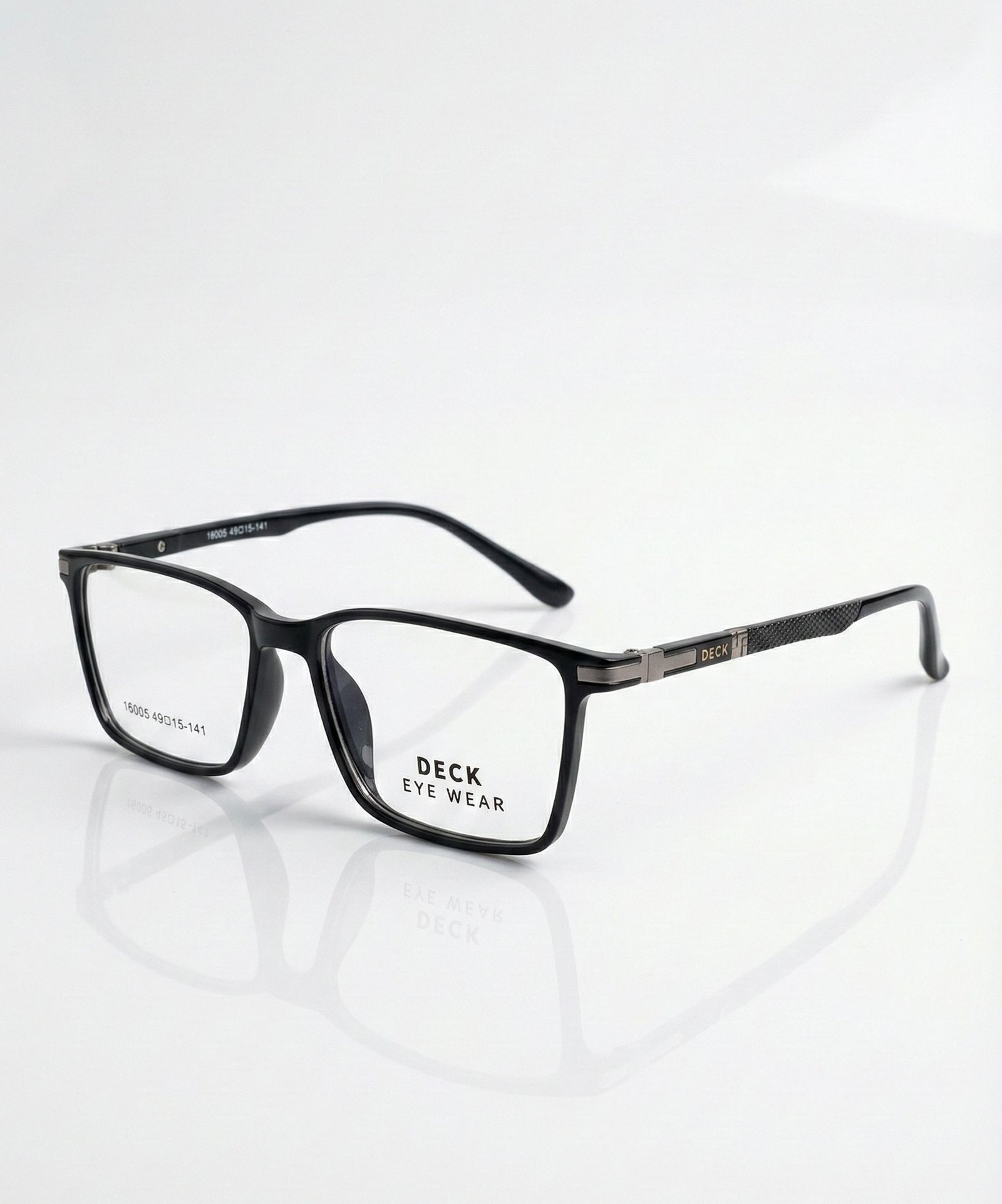 Feature Details Brand DECK Eye Wear Model Number 16005 Frame Shape Rectangle / Square Frame Color Matte Black Temple Design Textured Carbon-Fiber Style with Metal Accents Lens Width 49 mm Bridge Width 15 mm Temple Length 141 mm Material Lightweight Composite / Metal