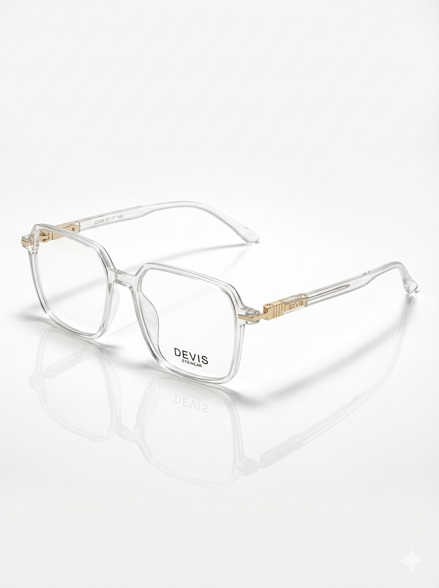 Add a touch of modern elegance to your eyewear collection with the Devis C2366 optical frames, exclusively available at Eye Zone US. This unisex model features a premium crystal transparent acetate frame that offers a subtle, sophisticated appearance, enhanced by luxurious gold metal hinges and temple details for a high-end finish.