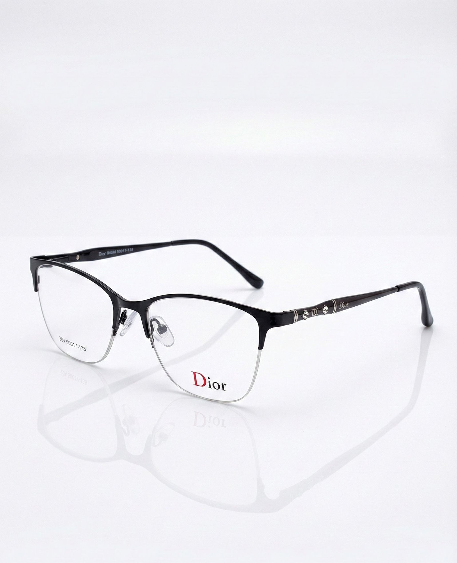 Step into luxury with these Dior-inspired semi-rimless eyeglasses from Eye Zone US. The sophisticated black metal frame features a modern half-rim design with elegant logo details on the temples, capturing the essence of high-fashion Parisian chic. Clear demo lenses offer pristine vision and are fully compatible with your custom prescription.