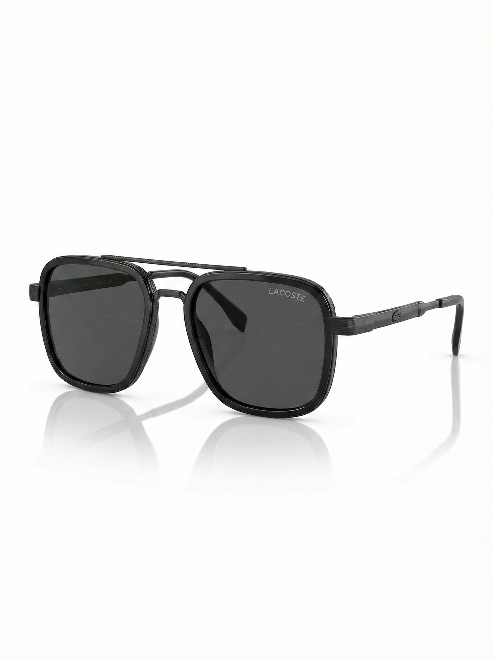 These sunglasses feature a robust matte black square navigator silhouette, designed to provide maximum coverage and style for an active lifestyle. The frame is accented with a textured double-bridge and the iconic Lacoste crocodile logo subtly embossed on the temples. Equipped with high-clarity smoke-tinted lenses, these glasses offer superior glare reduction and 100% UV protection, making them the ideal choice for driving, sports, or casual weekend outings.