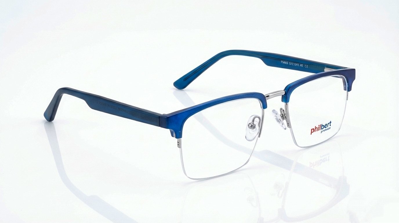 These contemporary Philbert Premium optical eyeglasses feature a stylish half-rim (semi-rimless bottom) design in vibrant blue with silver metal accents. The frame model FMK5 S115F 48 combines lightweight metal and durable acetate temples in matte blue for enhanced comfort and grip. Branded with the “philbert premium” logo etched on the clear demo lenses and temple markings, these glasses offer a versatile clubmaster-inspired silhouette that’s perfect for professional or casual wear. Adjustable nose pads ensure a secure fit, making them ideal for those seeking affordable premium eyewear with a bold color pop and modern appeal.