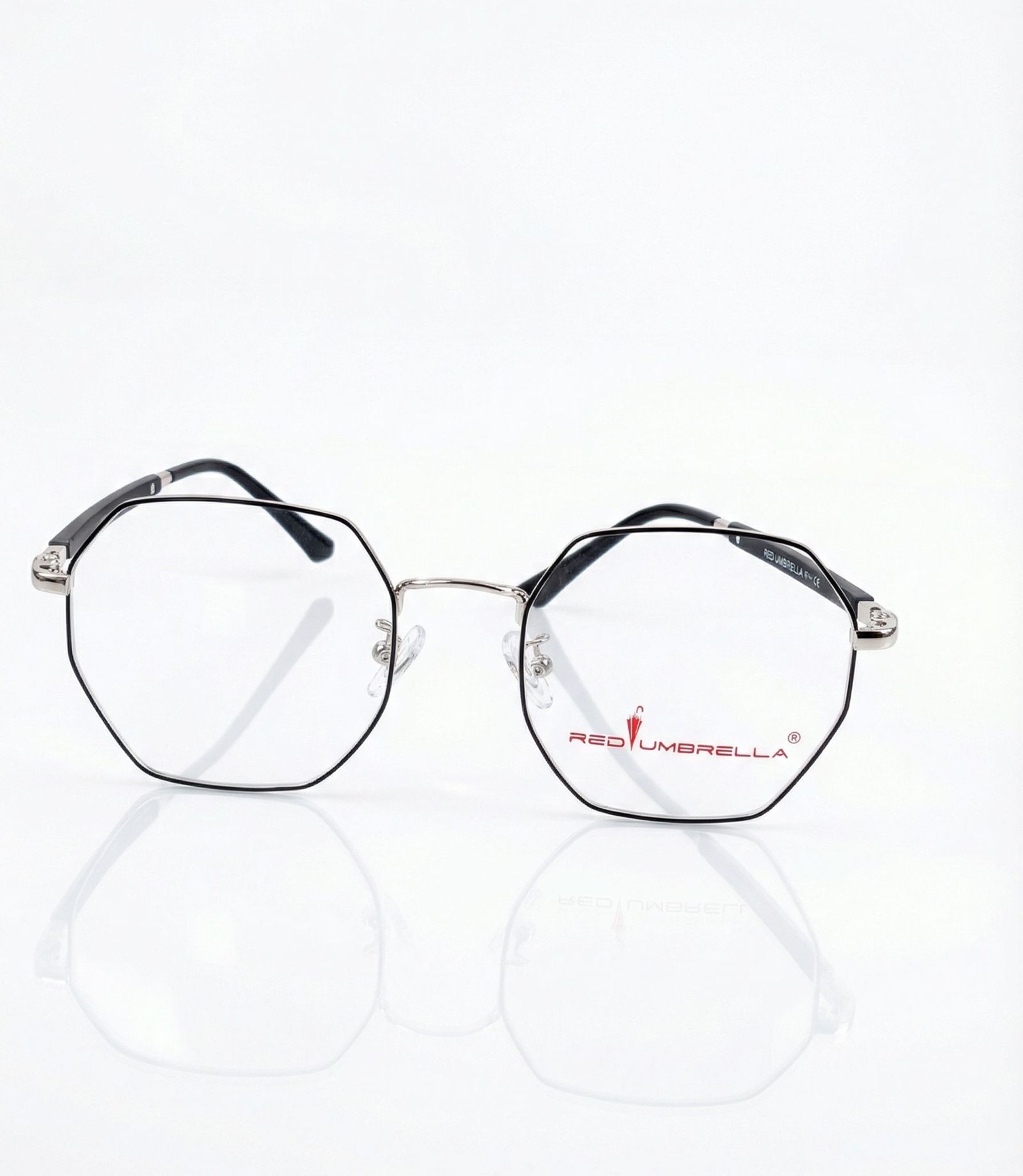 Add a touch of modern geometric elegance to your look with these premium octagonal eyeglasses from the Red Umbrella collection at Anmol Optical. The unique eight-sided frame combines sleek black acetate rims with shiny silver-tone metal accents and temples, creating a bold, contemporary silhouette that stands out while remaining versatile for both men and women.