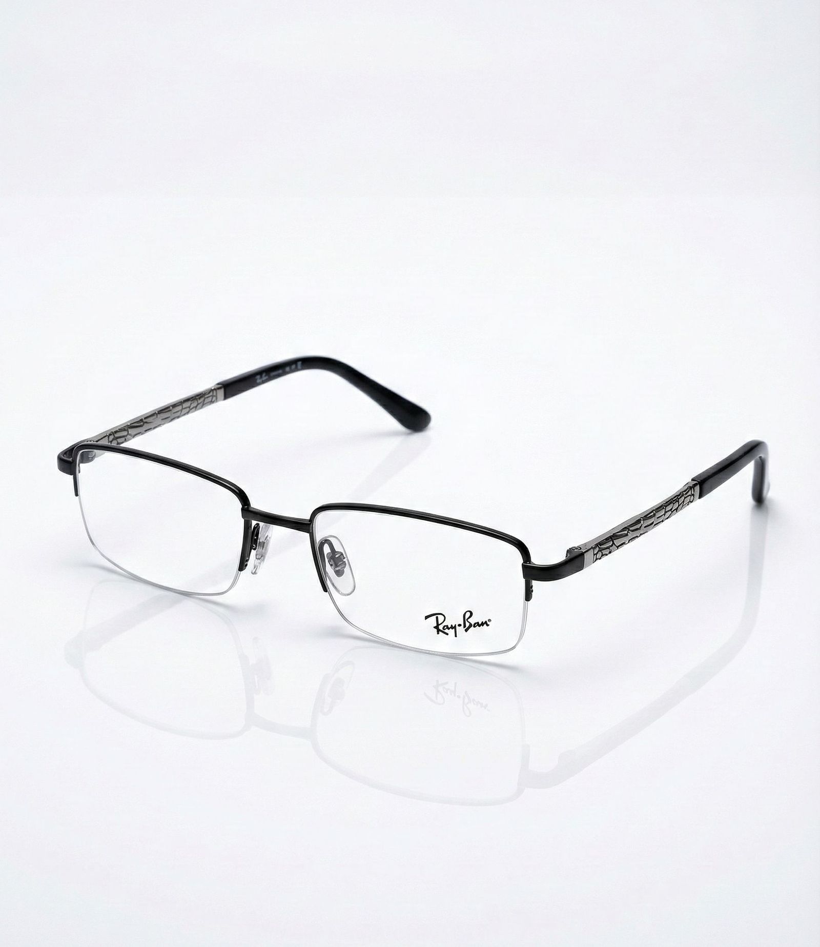 Get the legendary cool factor with these Ray-Ban inspired semi-rimless eyeglasses from Eye Zone US. The sleek black metal frame features a modern half-rim design with iconic patterned temples that capture the timeless Ray-Ban aesthetic – perfect blend of classic style and contemporary edge. Clear demo lenses deliver crisp vision and are fully compatible with your prescription needs.